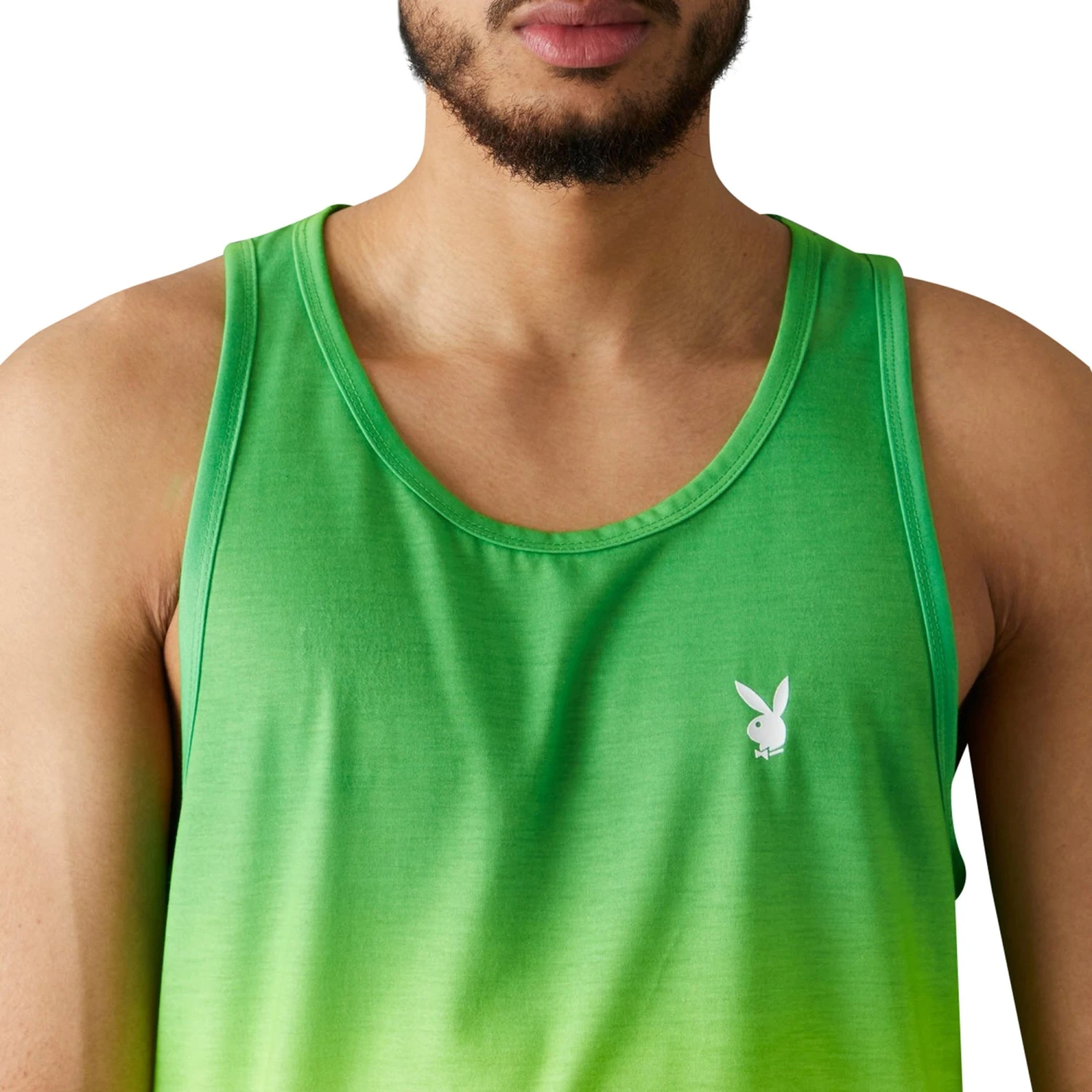 The brighter the better! Keep your wardrobe light and fun this summer. This t-shirt features embroidered playboy bunny graphic, color fade print, tank sleeves and scoop neckline.